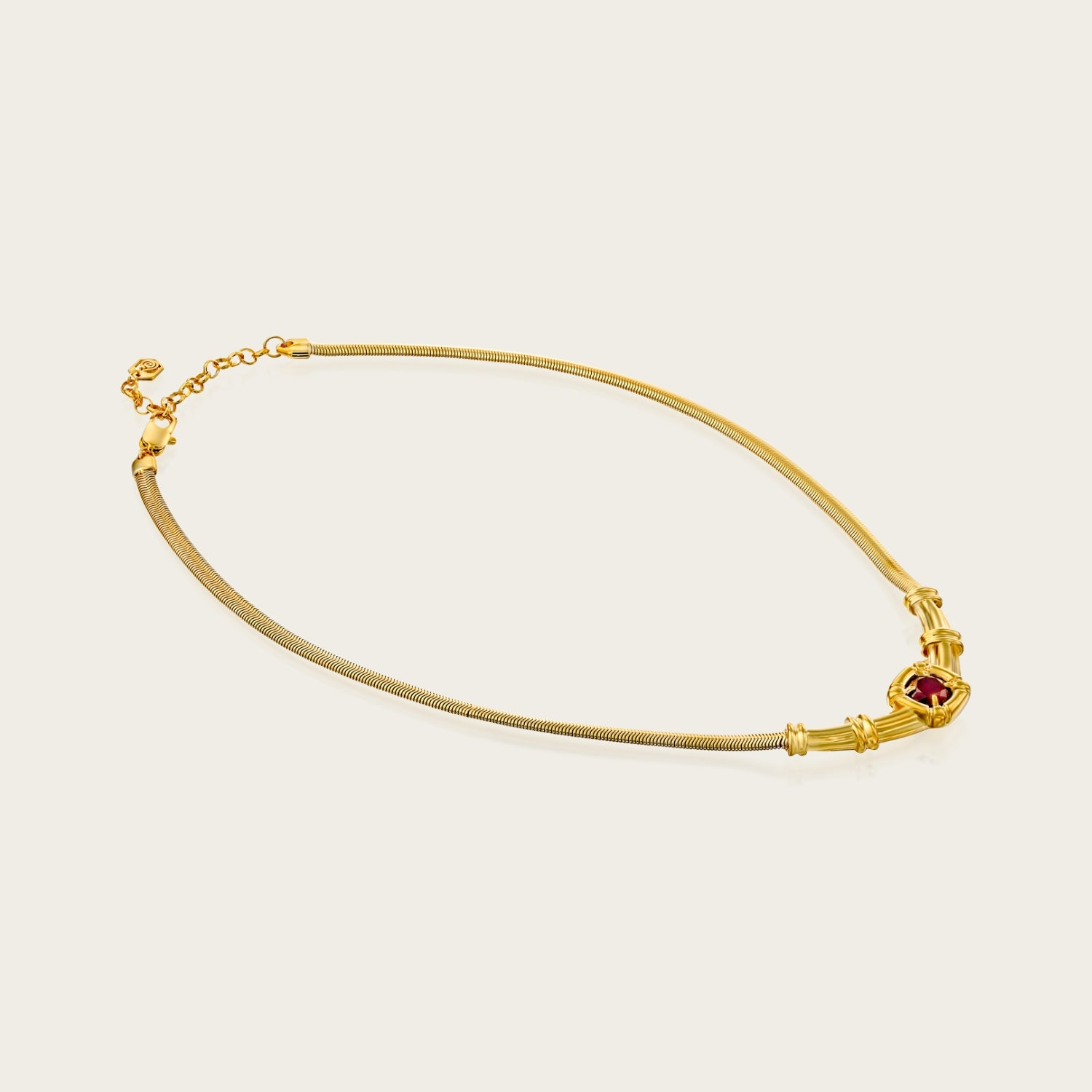 A striking puffy snake necklace crafted with 18K yellow gold over brass, featuring a gracefully graduated design that leads to a bold centerpiece. The pendant showcases a smooth, rounded square with subtle corner grooves and delicate embedded stripes. At its heart lies a natural red garnet gemstone, radiating warmth and timeless allure