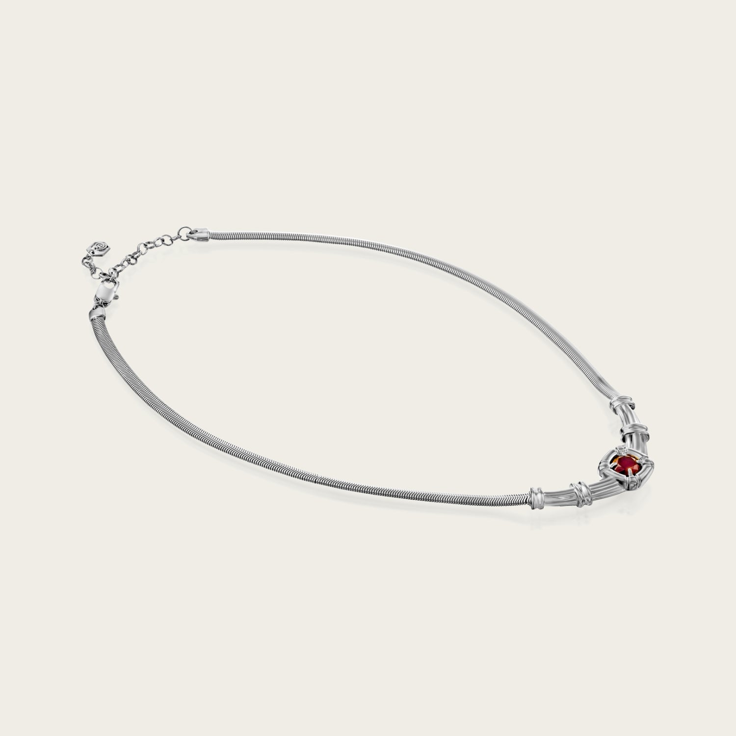 A striking puffy snake necklace crafted with 18K white gold over brass, featuring a gracefully graduated design that leads to a bold centerpiece. The pendant showcases a smooth, rounded square with subtle corner grooves and delicate embedded stripes. At its heart lies a natural red garnet gemstone, radiating warmth and timeless allure