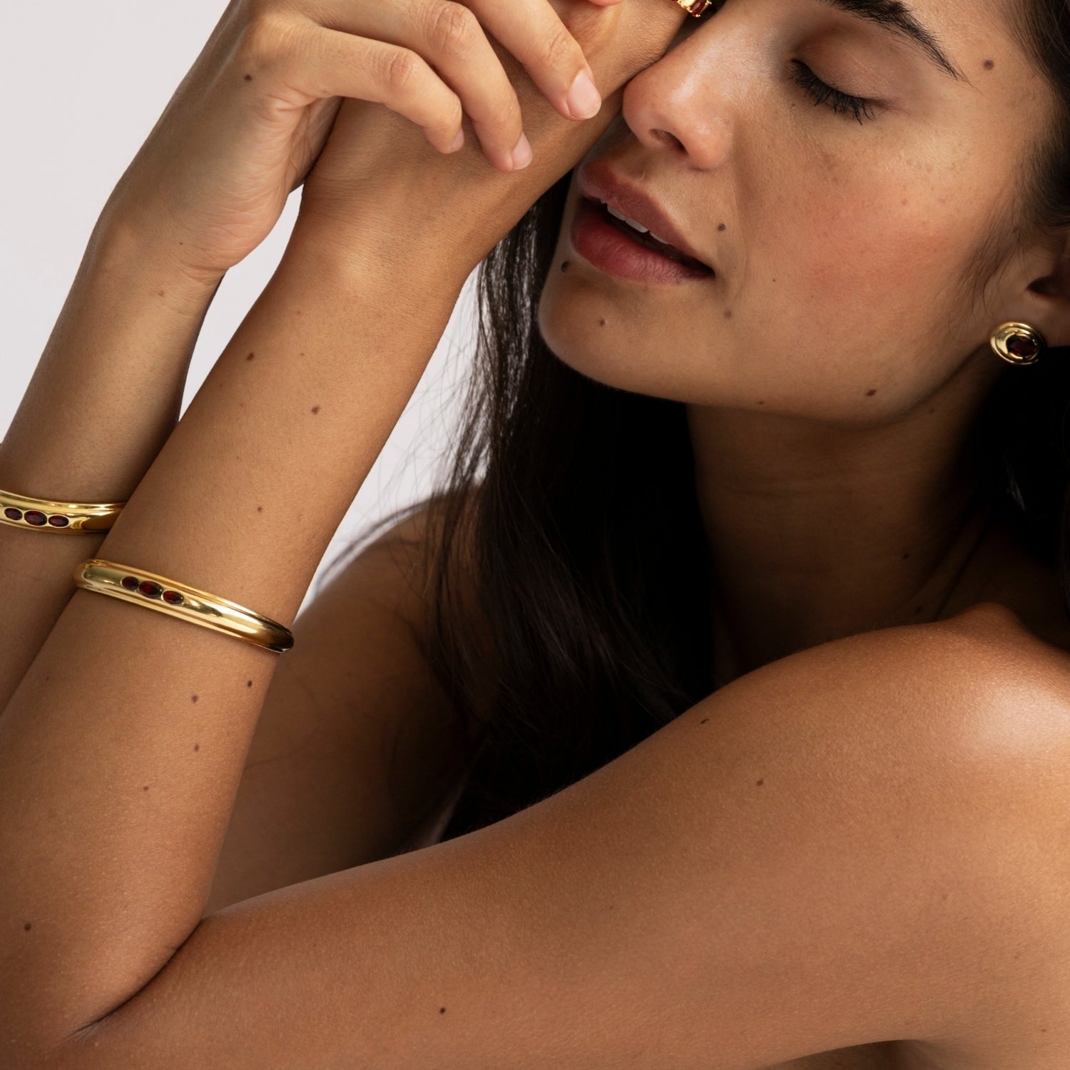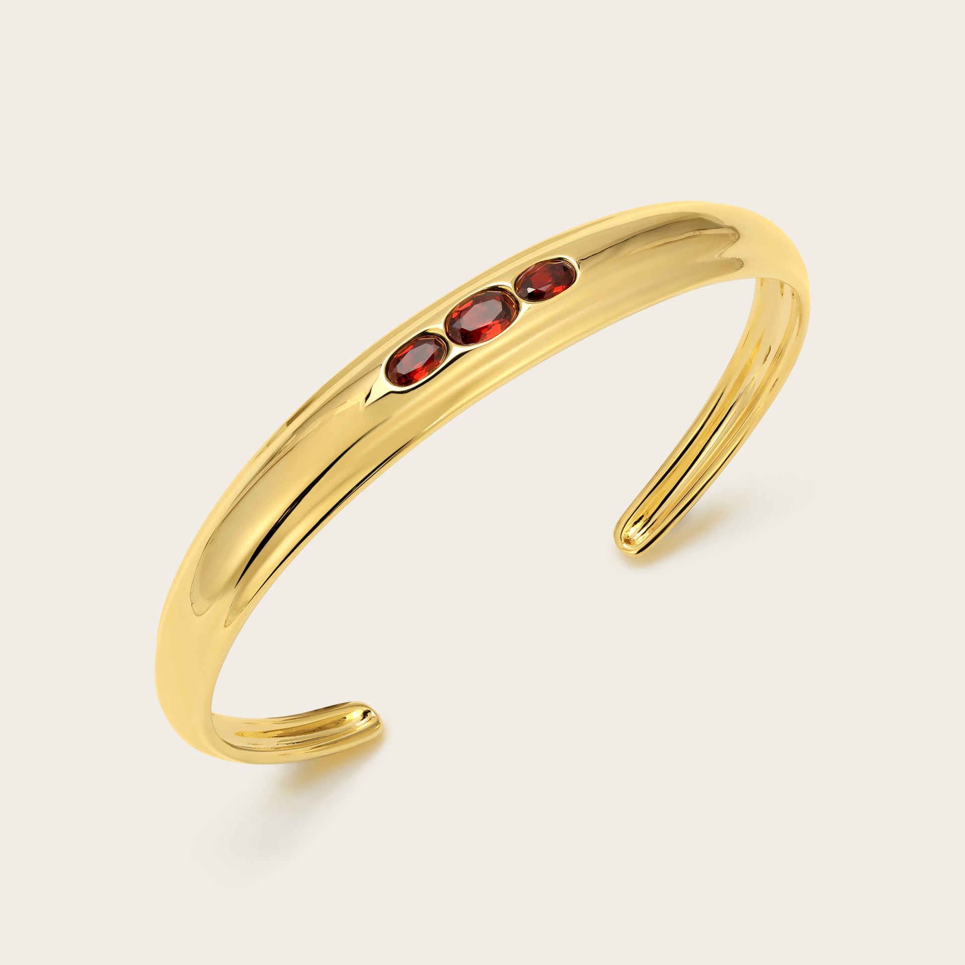 A stunning bangle bracelet featuring three natural embedded red garnet stones, creating a beautiful gradation effect. The central stone, slightly larger, is flanked by two smaller ones, enhancing the bracelet’s elegant flow. Tapered at both ends, the bangle gradually widens toward the center, where the stones are set, offering a refined and graceful design