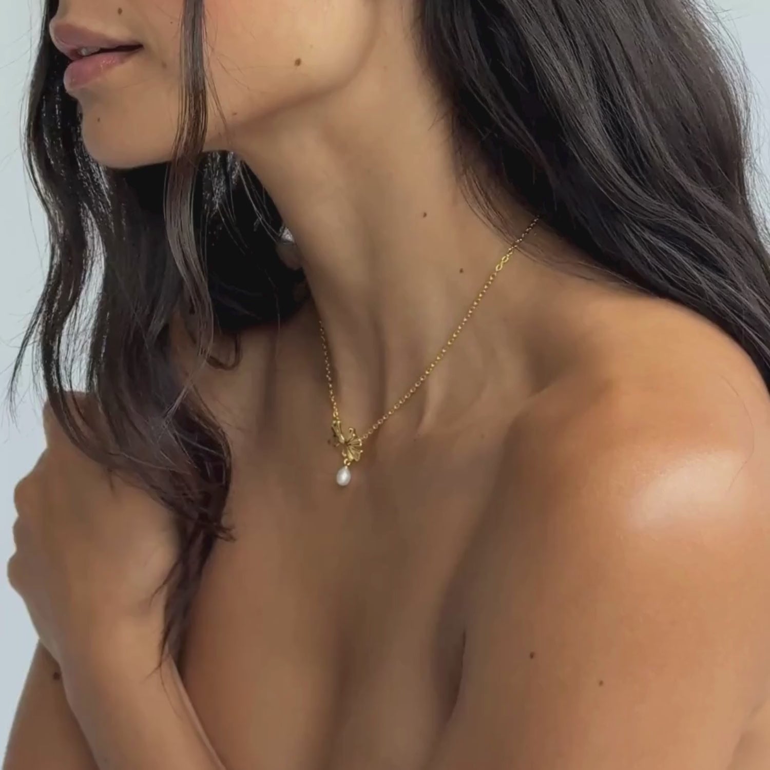 A delicate necklace featuring Sereia’s signature flower pendant, beautifully accented with a natural freshwater pearl. Designed to express subtle elegance and charm, it’s a graceful addition to any look